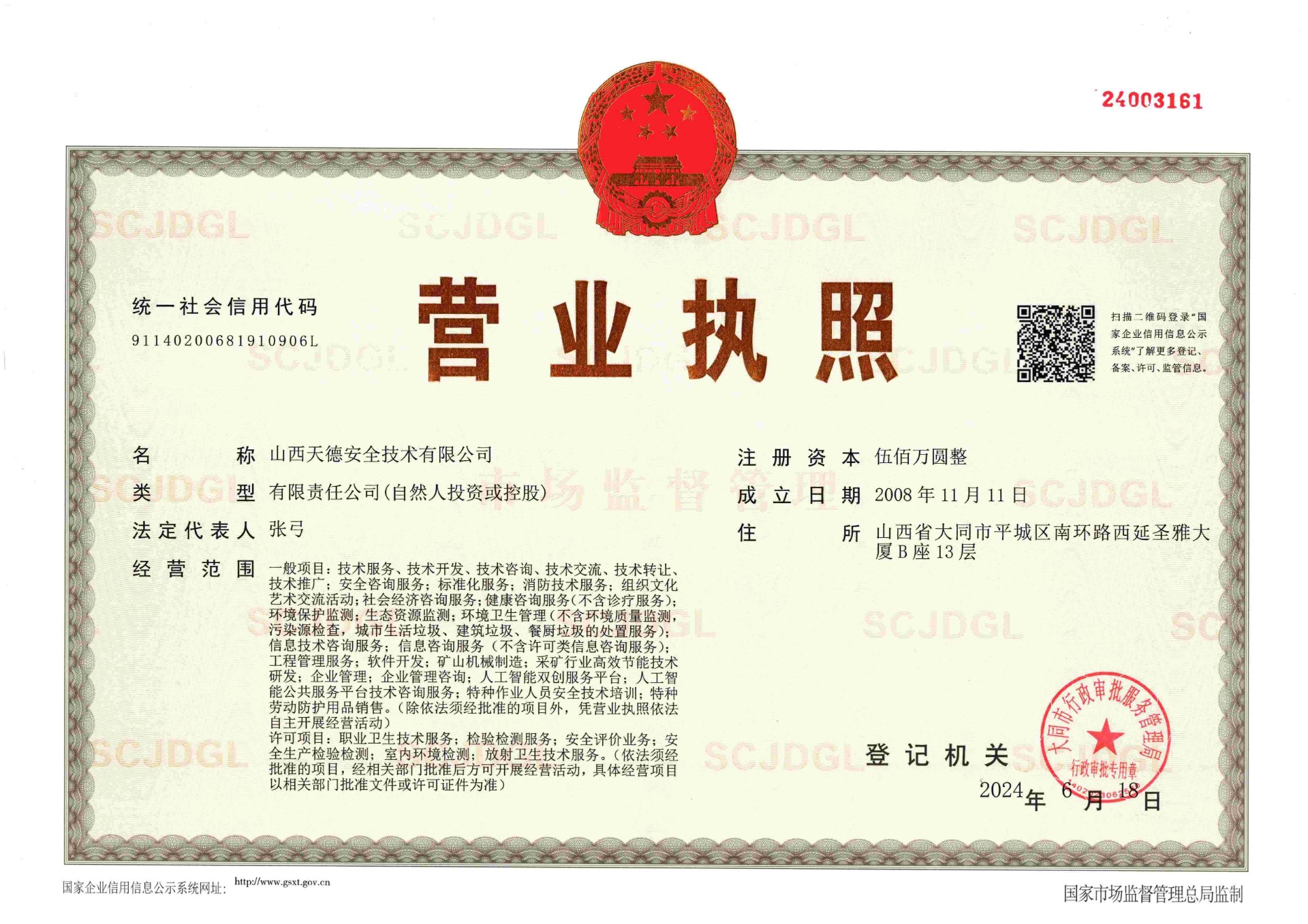 山西天德安全技術有限公司成立于2008年11月,是經山西省大同市工商行政管理局批準注冊的具有獨立法人資格的有限責任公司,地址位于大同市城區南環路西延圣雅大廈B座13層,注冊資本人民幣500萬元。公司經營范圍許可項目為:職業衛生技術服務。(除依法須經批準的項目,經相關部門批準后方可開展經營活動,具體經營項目以相關部門批準文件或許可證件為準)。經營范圍一般項目為:安全咨詢服務、信息技術咨詢服務;工程管理服務;軟件開發:技術服務、技術開發、技術咨詢、技術交流、技術轉讓、技術推廣;礦山機械制造;采礦行業高效節能技術研發;社會經濟咨詢服務;信息咨詢服務啊(不含許可類信息咨詢服務);企業管理;企業管理咨詢;人工智能雙創服務平臺;人工智能公共服務平臺技術咨詢服務;特種作業人員安全技術培訓;礦山機械銷售:機械零件、零部件銷售;特種勞動防護用品銷售。(除依法須經批準的項目外,憑營業執照依法自主開展經營活動)。
